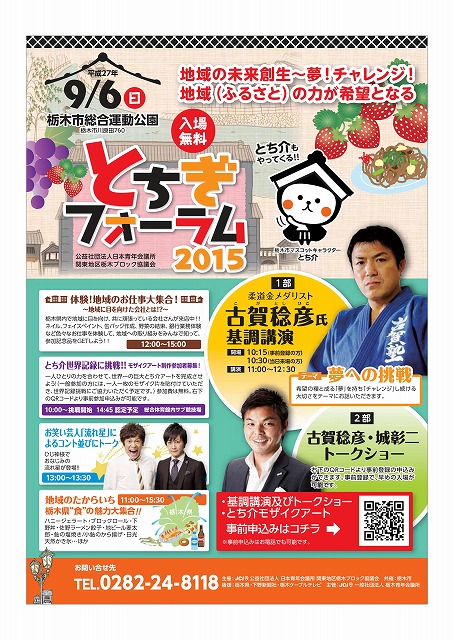 拝啓 盛夏の候、ますますご繁栄の事とお慶び申し上げます。日頃は栃木ブロック協議会の事業に対し深いご理解とご協力を賜り、厚く御礼申し上げます。2015年度栃木ブロック協議会は「希望に溢れる栃木の再興」を基本理念に、県内11の青年会議所が集結し、JC運動を展開しております。そのブロック協議会として最大の運動の発信の場である「とちぎフォーラム」が、本年度は栃木市において開催されます。JCメンバーだけではなく市民の皆様と共に学び、気づきを得ることで、まちづくりや人づくりに対する意識の昂揚を図ることが、希望あふれる栃木の創造へ繋がると考えております。多くのメンバーのご参加を心よりお待ちしております。 敬具